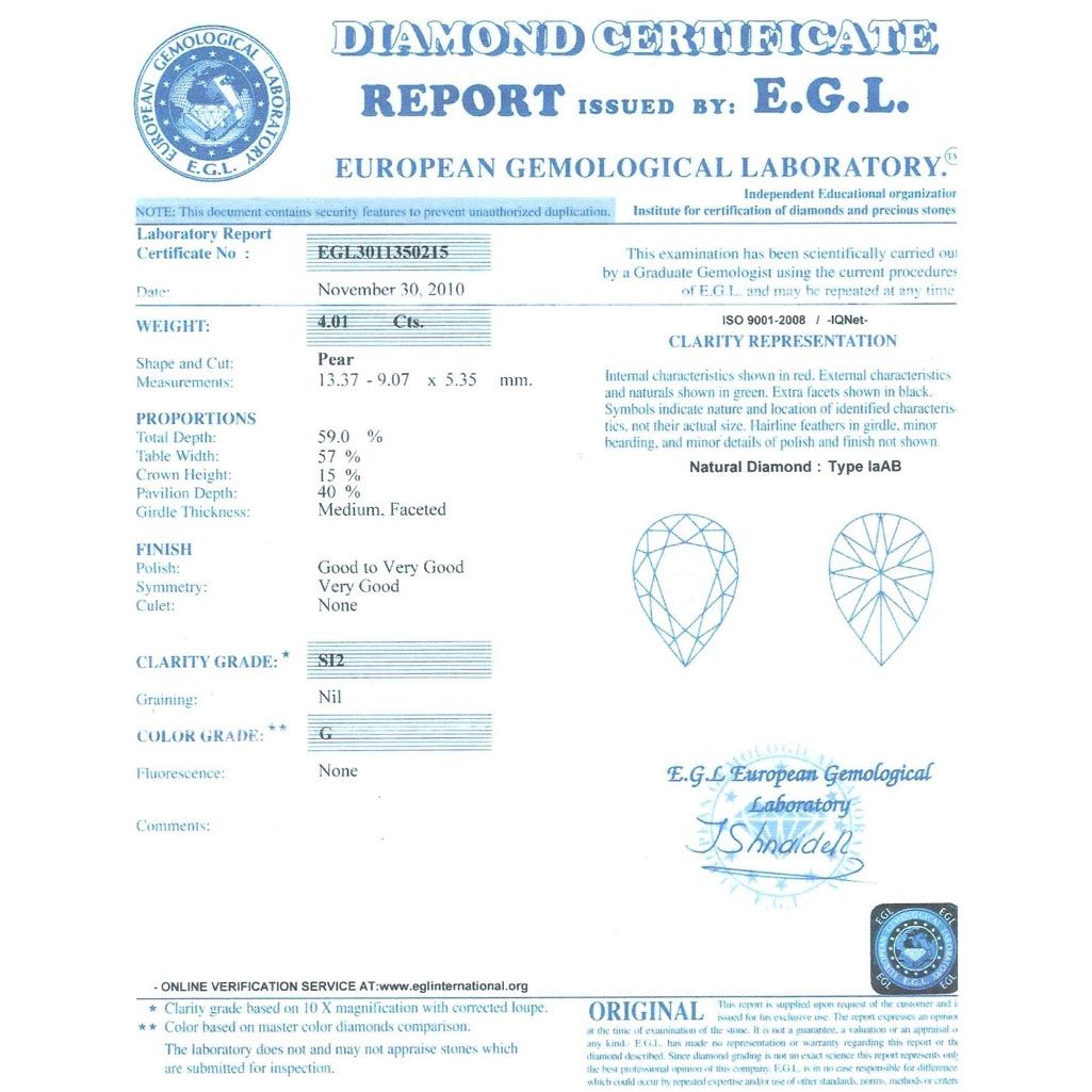 Diamond EGL Cert. Pear 4.01 ctw G, Si2 **|**|** 13.37-9.07x5.35mm;Cut Very Good; Polish Very Goodt; Symmetry Very Good; Fluo None; Depth 59%; table 57% ; MSRP: $70000