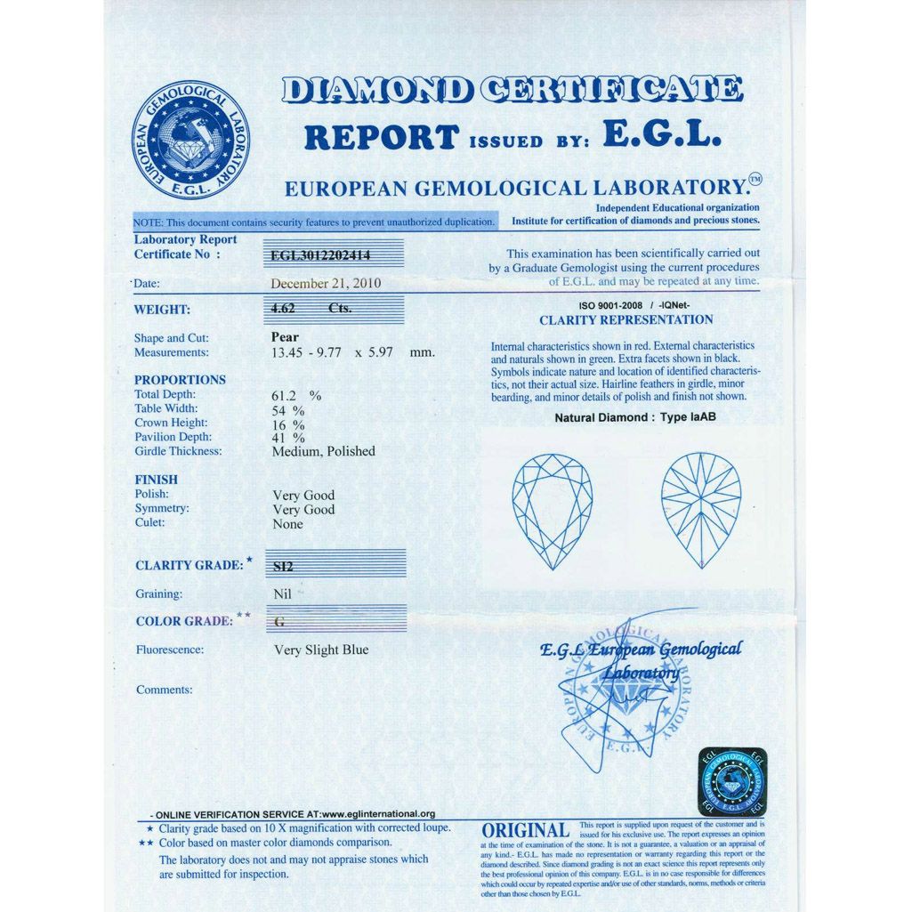 Diamond EGL Cert. Pear 4.62 ctw G, SI2 **|**|** 13.45-9.77x5.97mm;Cut Very Good; Polish Very Good; Symmetry Very Good; Fluo Very Slight Blue; Depth 61.2%; table 54% ; MSRP: $57200