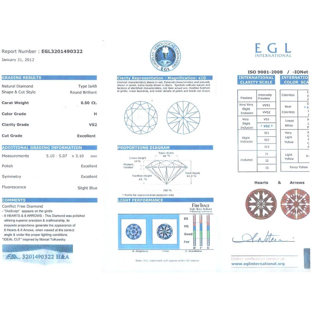 Diamond EGL Cert. Round 0.50 ctw H, Vs2 **|**|** 7.22-4.60x3.24mm;Cut Excellent; Polish Excellent; Symmetry Excellent; Fluo Slight Blue; Depth 61.0%; table 60% ; MSRP: $5000
