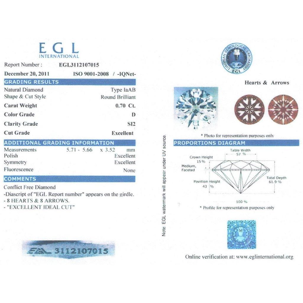 Diamond EGL Cert. Round 0.70 ctw D, Si2 **|**|** 5.71-5.66x3.52mm;Cut Excellent; Polish Excellent; Symmetry Excellent; Fluo None; Depth 61.9%; table 57% ; MSRP: $7000