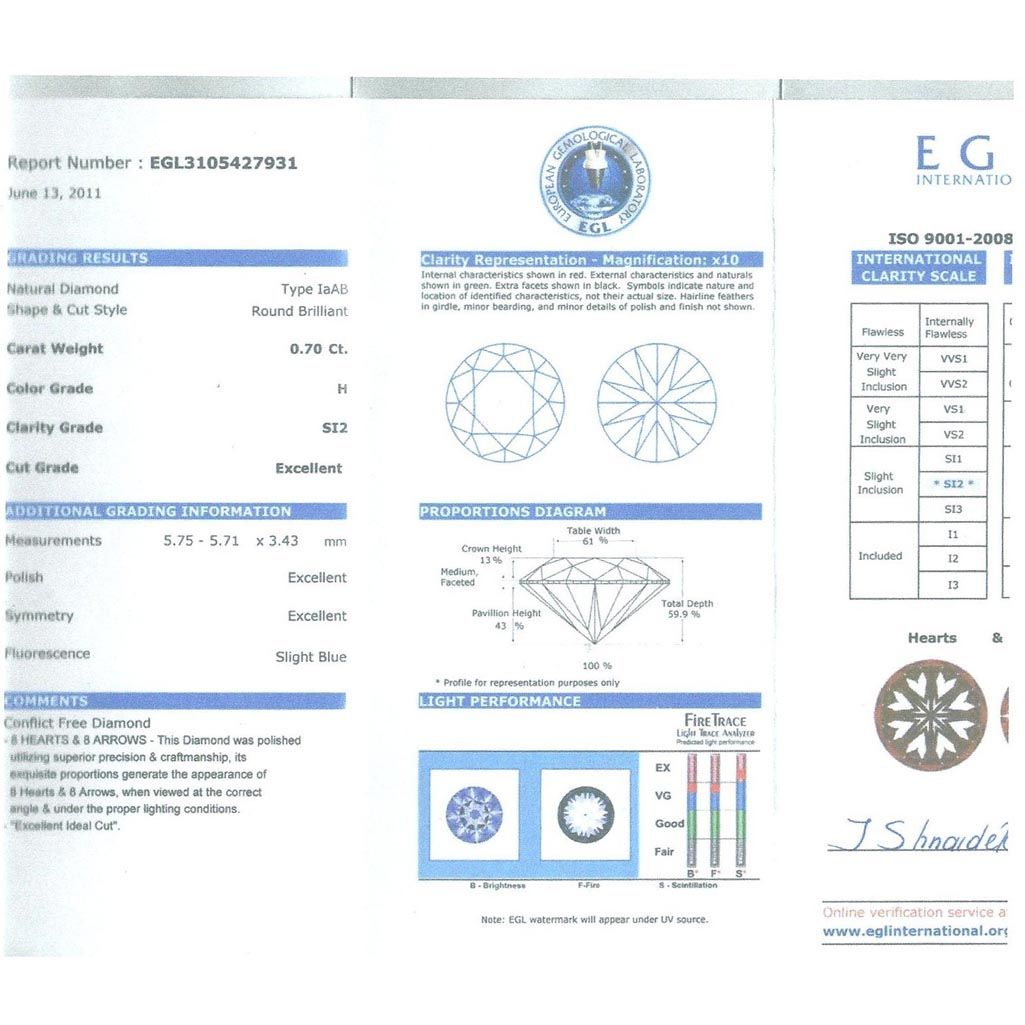 Diamond EGL Cert. Round 0.70 ctw H, Si2 **|**|** 5.75-5.71x3.43mm;Cut Excellent; Polish Excellent; Symmetry Excellent; Fluo Slight Blue; Depth 59.9%; table 61% ; MSRP: $7000