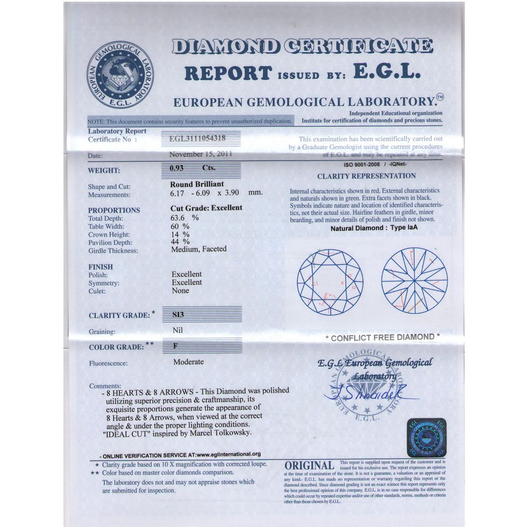 Diamond EGL Cert. Round 0.93 ctw F, SI3 **|**|** 6.17-6.09x3.90mm;Cut Excellent; Polish Excellent; Symmetry Excellent; Fluo Moderate; Depth 63.9%; table60% ; MSRP: $8900