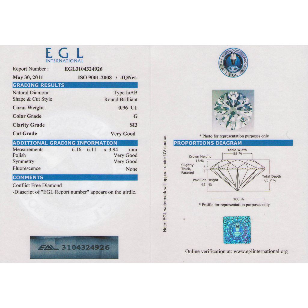 Diamond EGL Cert.  Round 0.96 ctw G, SI3 **|**|** 6.16-6.11x3.94mm;Cut Very Good; Polish Very Good; Symmetry Very Good; Fluo None; Depth 63.7%; table 55% ; MSRP: $7100