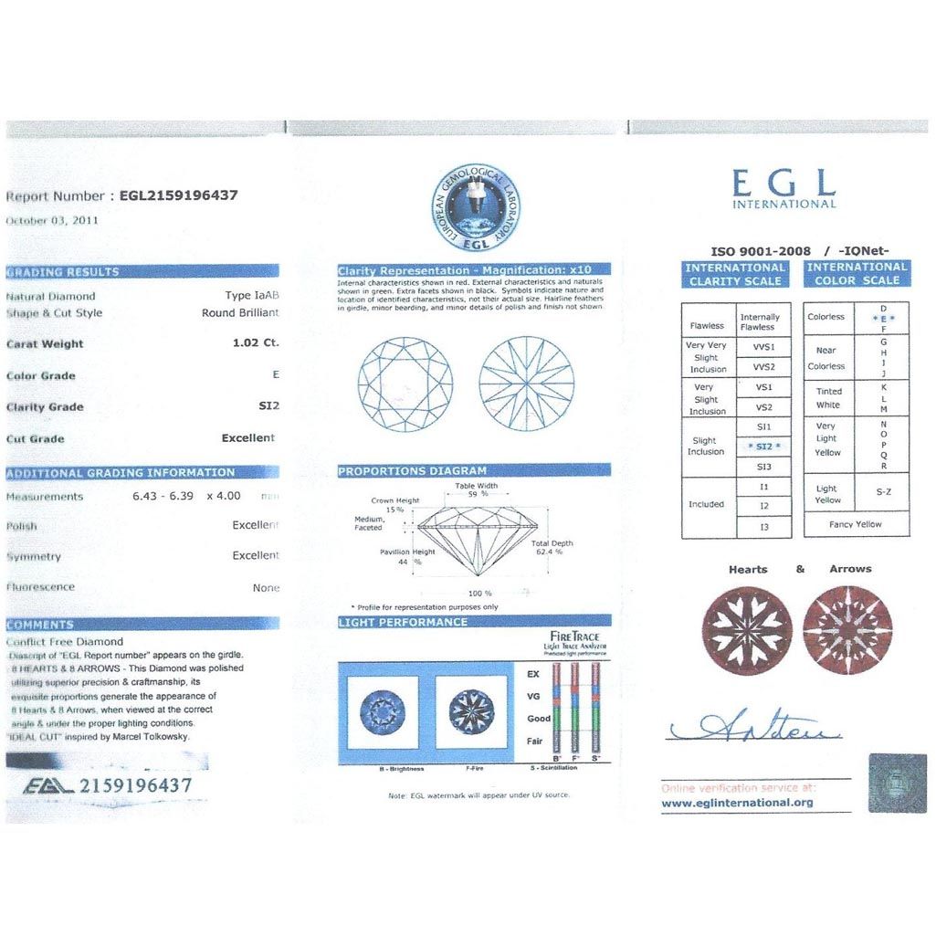 Diamond EGL Cert. Round 1.02 ctw E, Si2 **|**|** 6.43-6.39x4.00mm;Cut Excellent; Polish Excellent; Symmetry Excellent; Fluo None; Depth62.4%; table 59% ; MSRP: $12000