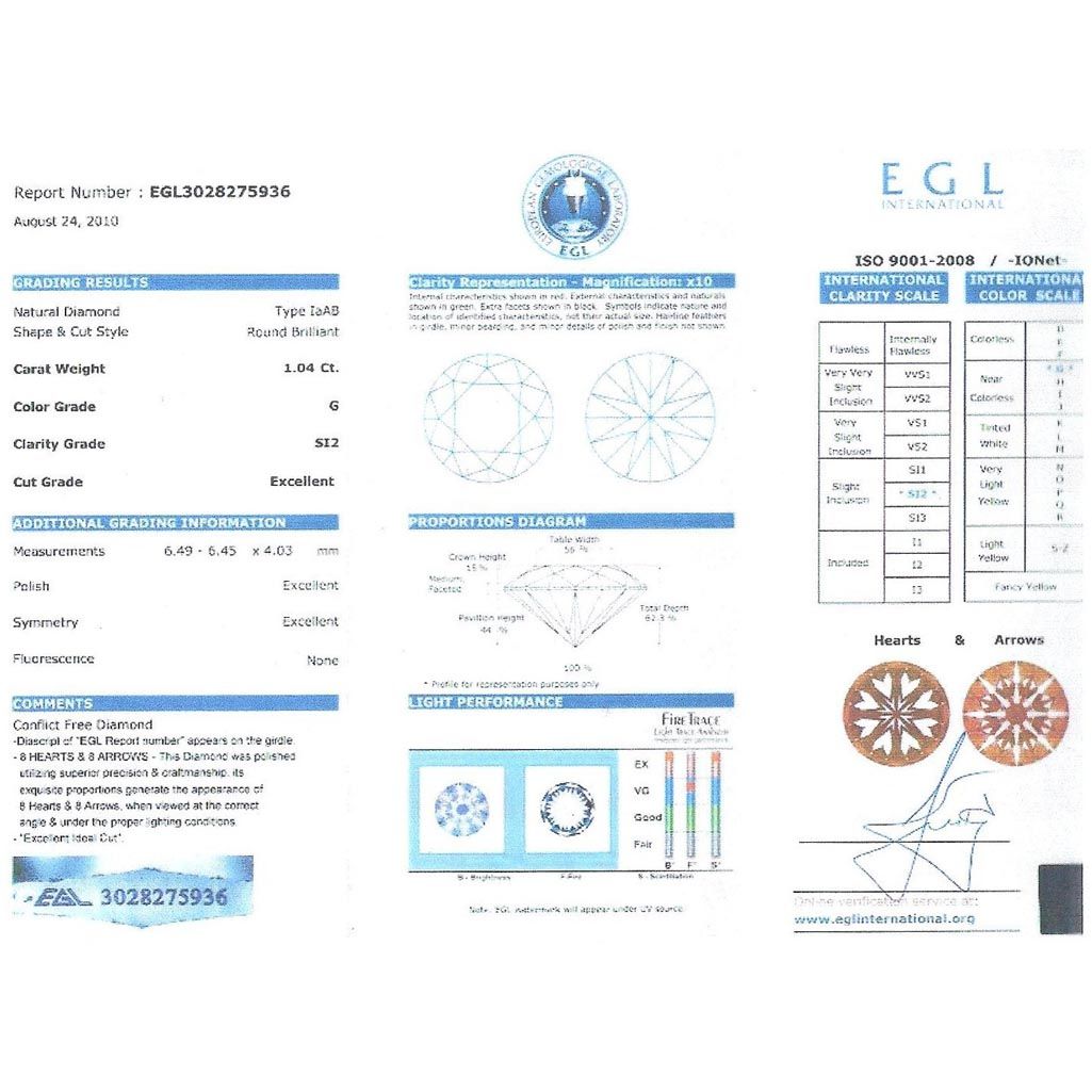 Diamond EGL Cert. Round 1.04 ctw G, Si2 **|**|** 6.49-6.45x4.03mm;Cut Excellent; Polish Excellent; Symmetry Excellent; Fluo None; Depth 62.3%; table 56% ; MSRP: $12000