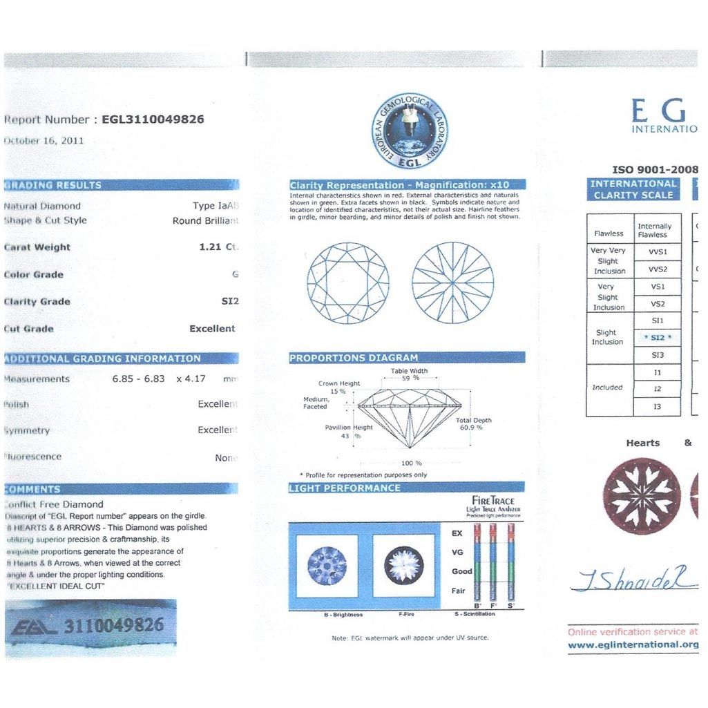 Diamond EGL Cert. Round 1.21 ctw G, Si2 **|**|** 6.85-6.83x4.17mm;Cut Excellent; Polish Excellent; Symmetry Excellent; Fluo None; Depth 60.9%; table 59% ; MSRP: $13000