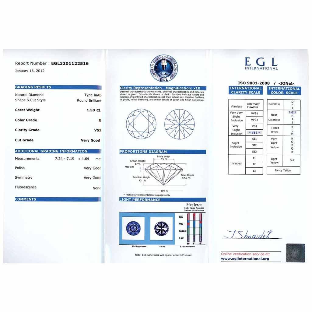 Diamond EGL Cert. Round 1.50 ctw G, VS2 **|**|** 7.24x7.19x4.64mm;Cut Very Good; Polish Good; Symmetry Very Good; Fluo None; Depth 64.3%; table 55% ; MSRP: $28000
