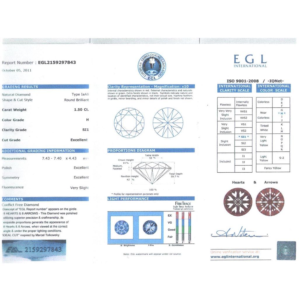 Diamond EGL Cert. Round 1.50 ctw H, Si1 **|**|** 7.43-7.40x4.43mm;Cut Excellent; Polish Excellent; Symmetry Excellent; Fluo Very Slight; Depth 59.7%; table 59% ; MSRP: $17000
