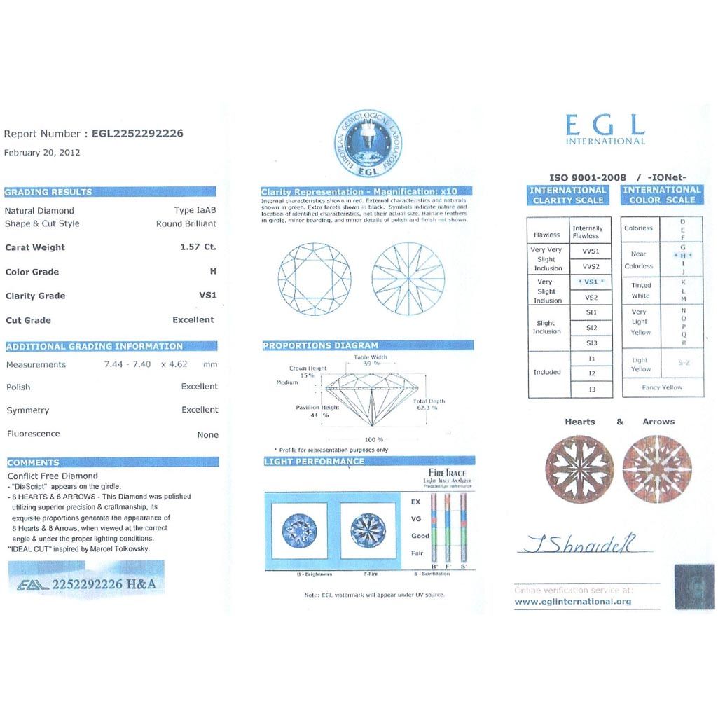 Diamond EGL Cert. Round 1.57 ctw H, VS1 **|**|** 7.44-7.40x4.62mm;Cut Excellent; Polish Excellent; Symmetry Excellent; Fluo None; Depth 62.3%; table 59% ; MSRP: $19000