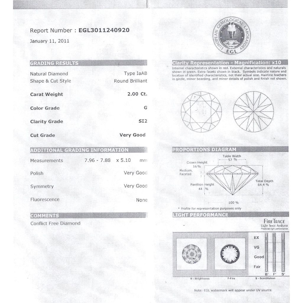Diamond EGL Cert. Round 2.00 ctw G, SI2 **|**|** 7.96-7.88x5.10mm;Cut Very Good; Polish Very Good; Symmetry Very Good; Fluo None; Depth 64.4%; table 57% ; MSRP: $27900