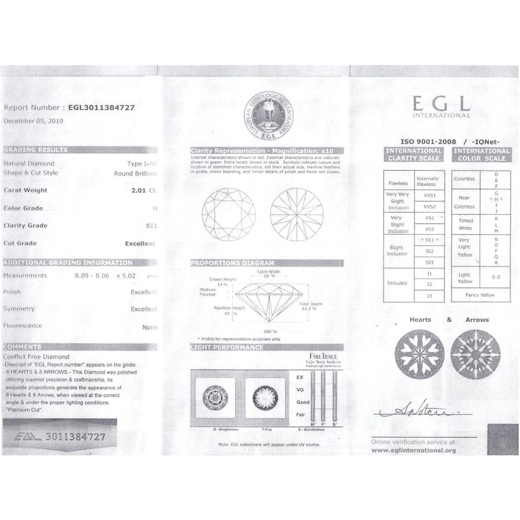 Diamond EGL Cert. Round 2.01 ctw H, SI1 **|**|** 8.09-8.06x5.02mm;Cut Excellent; Polish Excellent; Symmetry Excellent; Fluo None; Depth 62.2%; table59% ; MSRP: $28500
