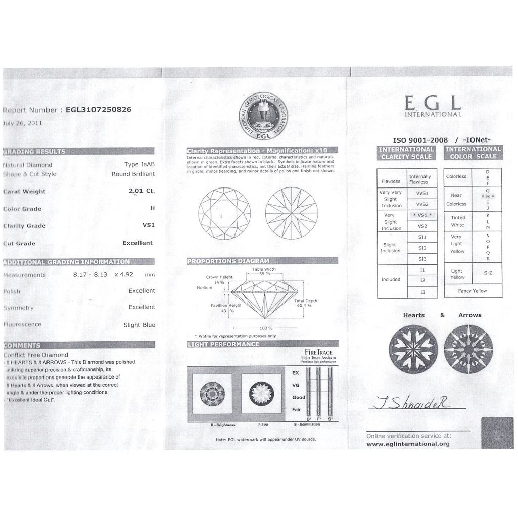Diamond EGL Cert. Round 2.01 ctw H, VS1 **|**|** 8.17-8.13x4.92mm;Cut Excellent; Polish Excellent; Symmetry Excellent; Fluo Slight Blue; Depth 60.4%; table 59% ; MSRP: $40100