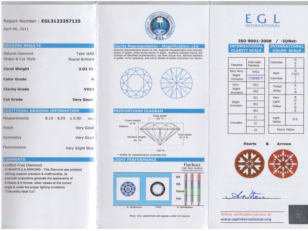 Diamond EGL Cert. Round 2.02 ctw H, VVS2 **|**|** 8.10-8.05x5.00mm;Cut Very Good; Polish Very Good; Symmetry Very Good; Fluo Very Slight Blue; Depth 61.9%; table 60% ; MSRP: $35000