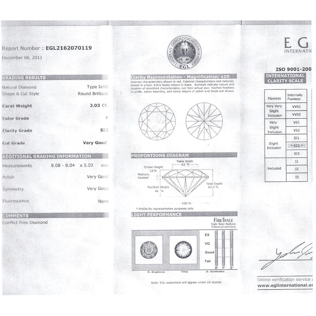 Diamond EGL Cert Round 2.03 ctw F, SI2 **|**|** 8.08-8.04x5.03mm;Cut Very Good; Polish Very Good; Symmetry Very Good; Fluo None; Depth 62.4%; table 63% ; MSRP: $25000