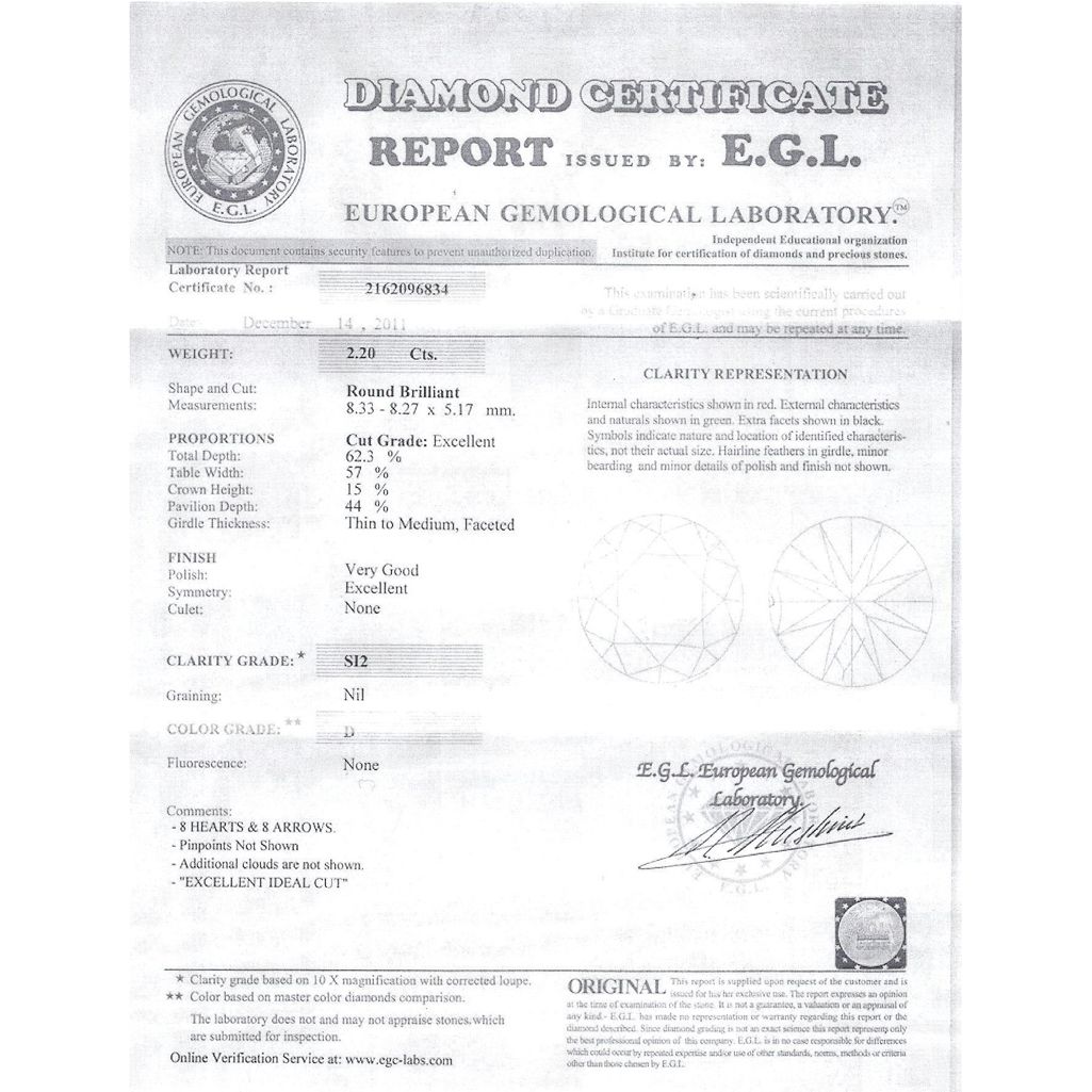 Diamond EGL Cert. Round 2.20 ctw D, SI2 **|**|** 8.33-8.27x5.17mm;Cut Very Good; Polish Very Good; Symmetry Very Good; Fluo None; Depth 62.3%; table 57% ; MSRP: $25000