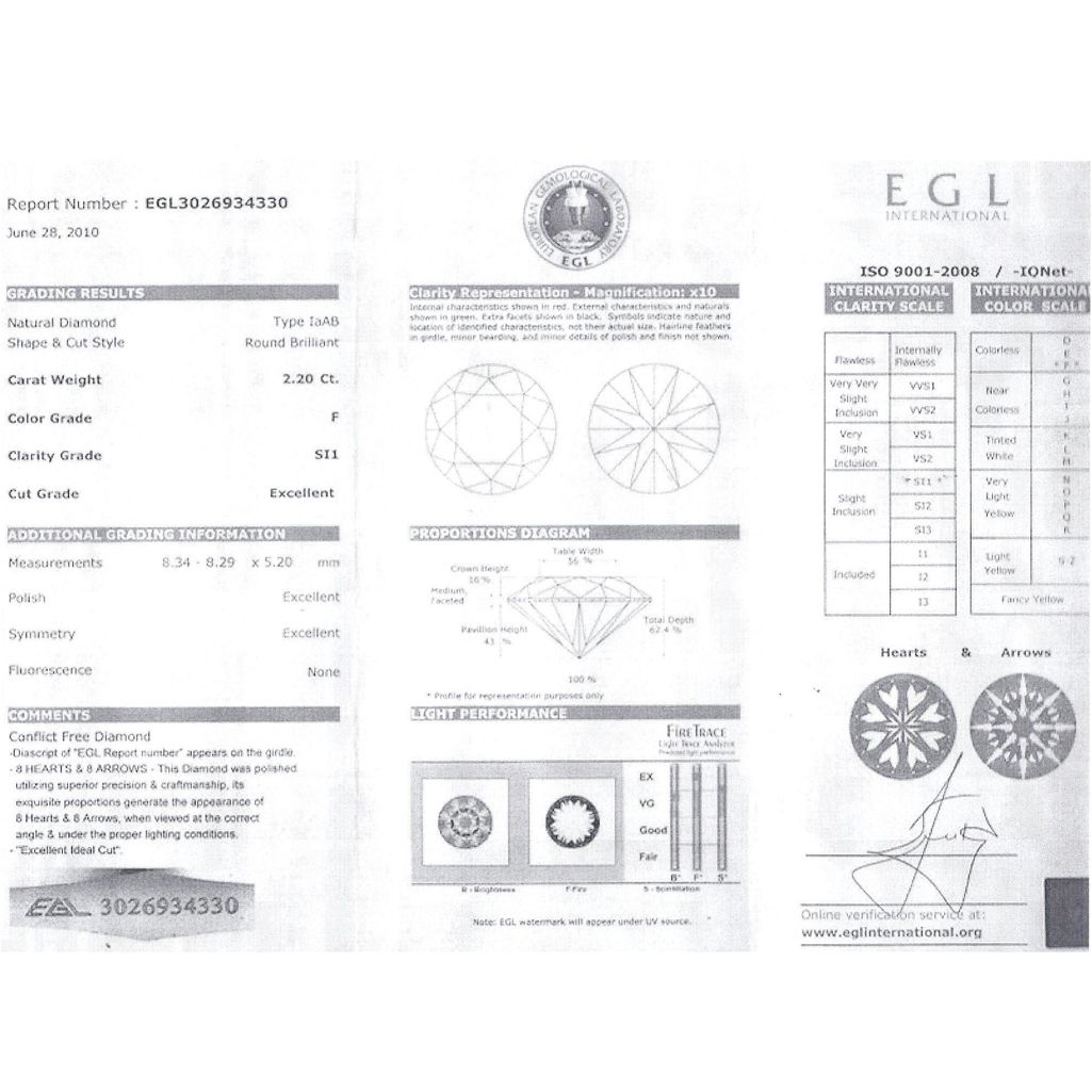 Diamond EGL Cert.Round 2.20 ctw F, SI1 **|**|** 8.34-8.29x5.20mm;Cut Excellent; Polish Excellent; Symmetry Excellent; Fluo Slight Blue; Depth 62.4%; table56% ; MSRP: $46000