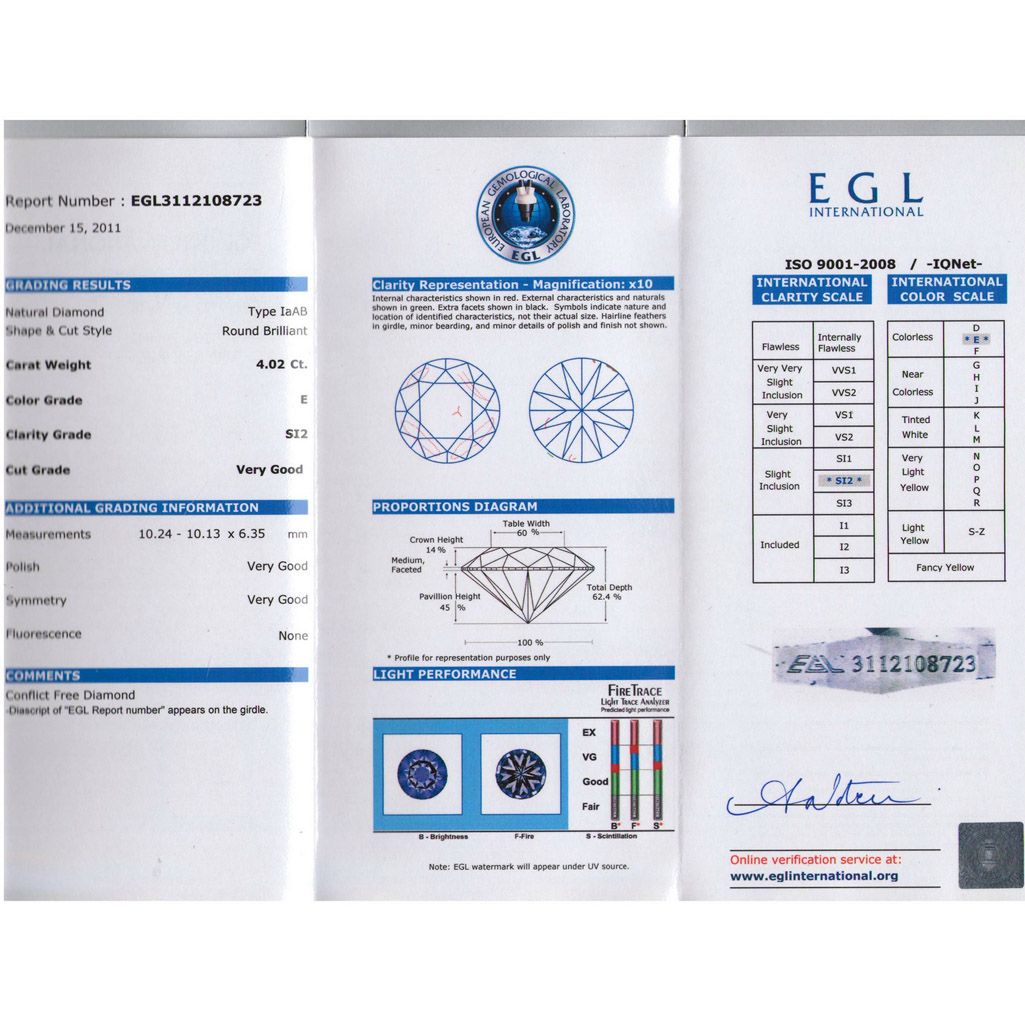 Diamond EGL Cert. Round 4.02 ctw E, SI2 **|**|** 10.24-10.13x6.35mm;Cut Very Good; Polish Very Good; Symmetry Very Good; Fluo None; Depth 62.4%; table 60% ; MSRP: $72000