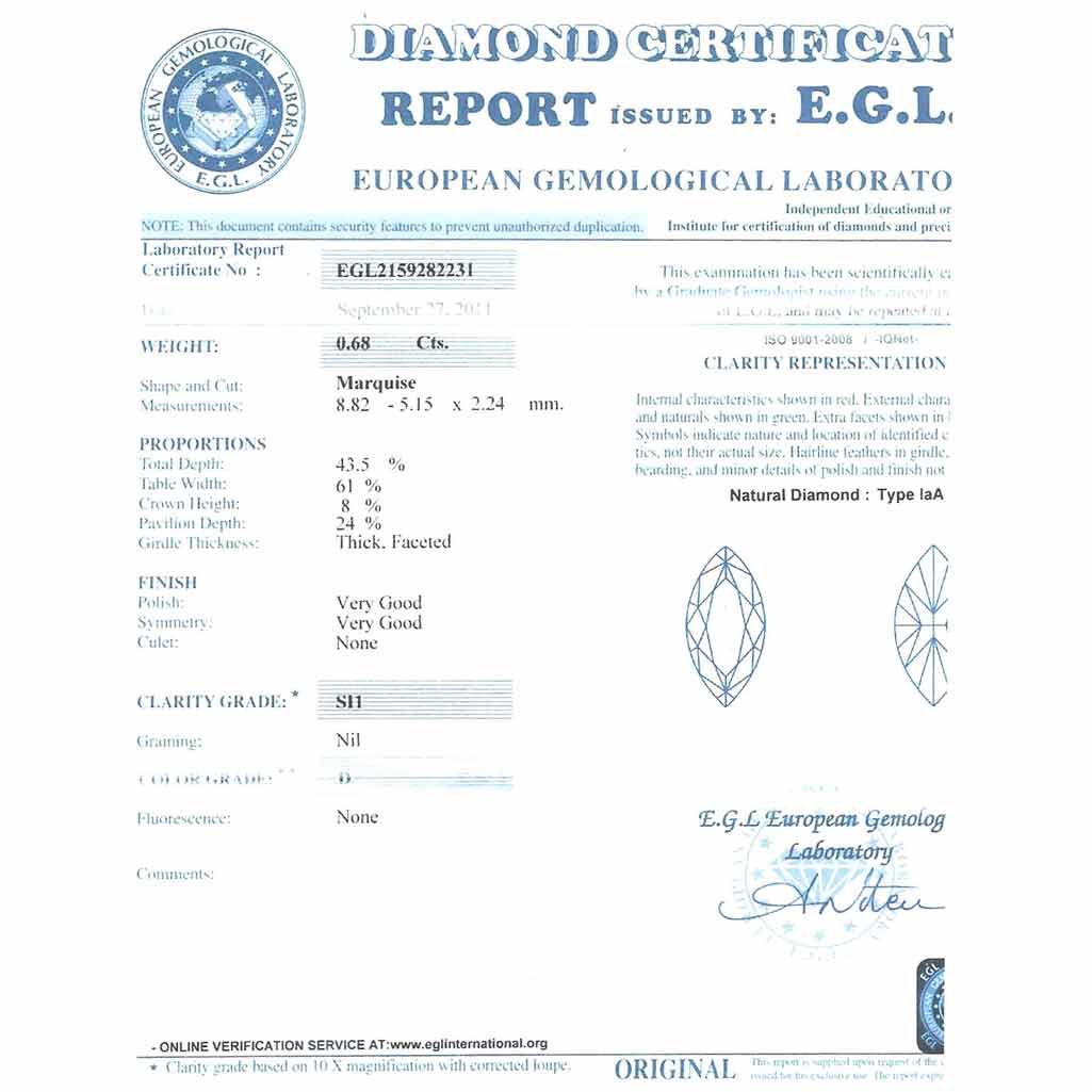 Diamond EGL Certfied Marquise 0.68 ctw D, SI1 **|**|** 8.82x5.15x2.24mm;Cut Very Good; Polish Very Good; Symmetry Very Good; Fluo None; Depth 43.5%; Table 61% ; MSRP: $2776