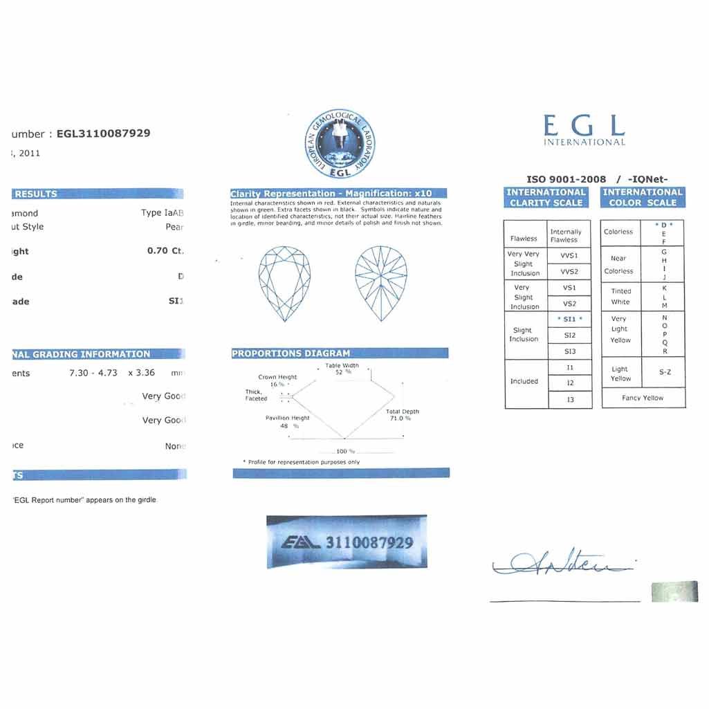 Diamond EGL Certfied Pear 0.70 ctw D, SI1 **|**|** 7.30x4.73x3.36mm;Cut Very Good; Polish Very Good; Symmetry Very Good; Fluo None; Depth 71.0%; Table 52% ; MSRP: $4128
