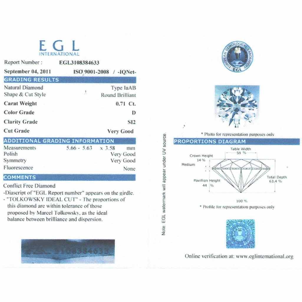 Diamond EGL Certfied Round 0.71 ctw D, SI2 **|**|** 5.66x5.63x3.58mm;Cut Very Good; Polish Very Good; Symmetry Very Good; Fluo None; Depth 63.4%; Table 59% ; MSRP: $4772