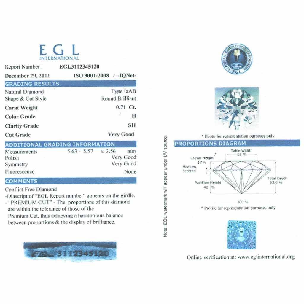 Diamond EGL Certfied Round 0.71 ctw H, SI1 **|**|** 5.63x5.57x3.56mm;Cut Very Good; Polish Very Good; Symmetry Very Good; Fluo None; Depth 63.6%; Table 55% ; MSRP: $4308