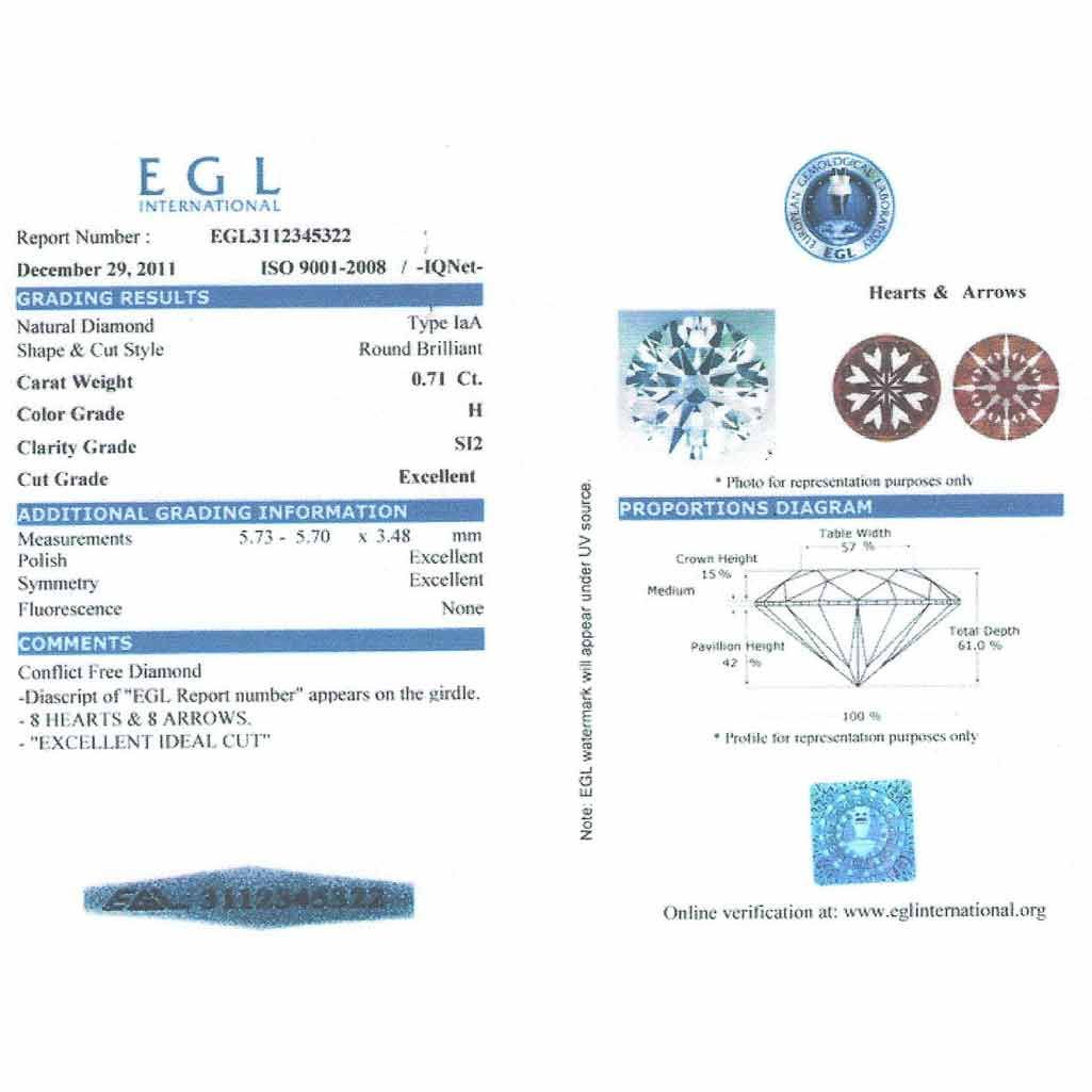 Diamond EGL Certfied Round 0.71 ctw H, SI2 **|**|** 5.73x5.70x3.48mm;Cut Excellent; Polish Excellent; Symmetry Excellent; Fluo None; Depth 61%; table 57% ; MSRP: $5040