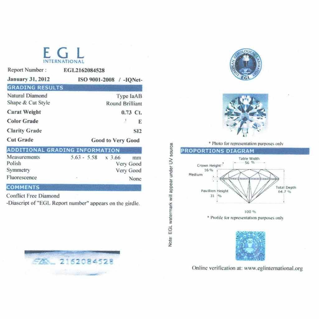 Diamond EGL Certfied Round 0.73 ctw E, SI2 **|**|** 5.63x5.58x3.66mm;Cut Very Good; Polish Very Good; Symmetry Very Good; Fluo None; Depth 64.7%; Table 56% ; MSRP: $4600