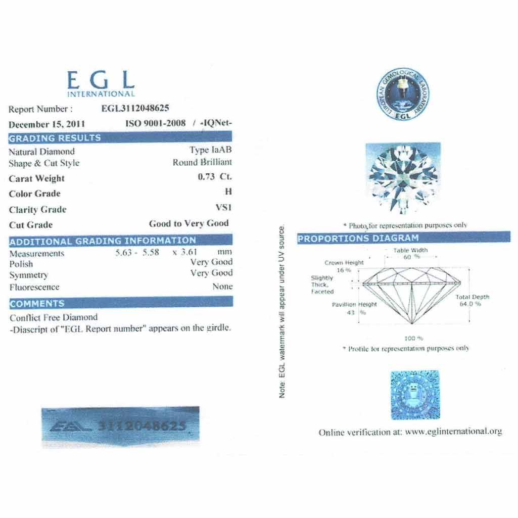 Diamond EGL Certfied Round 0.73 ctw H, VSI **|**|** 5.63x5.58x3.61mm;Cut Very Good; Polish Very Good; Symmetry Very Good; Fluo None; Depth 64%; Table 60% ; MSRP: $5112