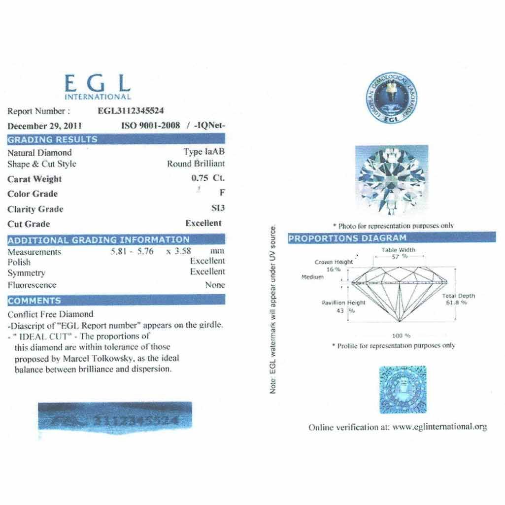 Diamond EGL Certfied Round 0.75 ctw F, SI3 **|**|** 5.81x5.76x3.58mm;Cut Excellent; Polish Excellent; Symmetry Excellent; Fluo None; Depth 61.8%; table 57% ; MSRP: $5040