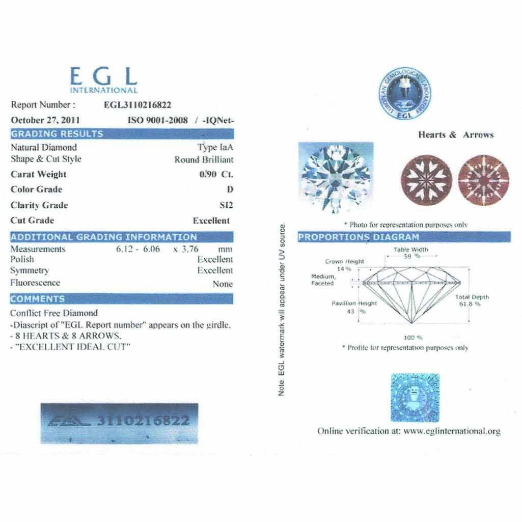Diamond EGL Certfied Round 0.90 ctw D, SI2 **|**|** 6.12x6.06x3.76mm;Cut Excellent; Polish Excellent; Symmetry Excellent; Fluo Slight Blue; Depth 61.8%; table 59% ; MSRP: $7940