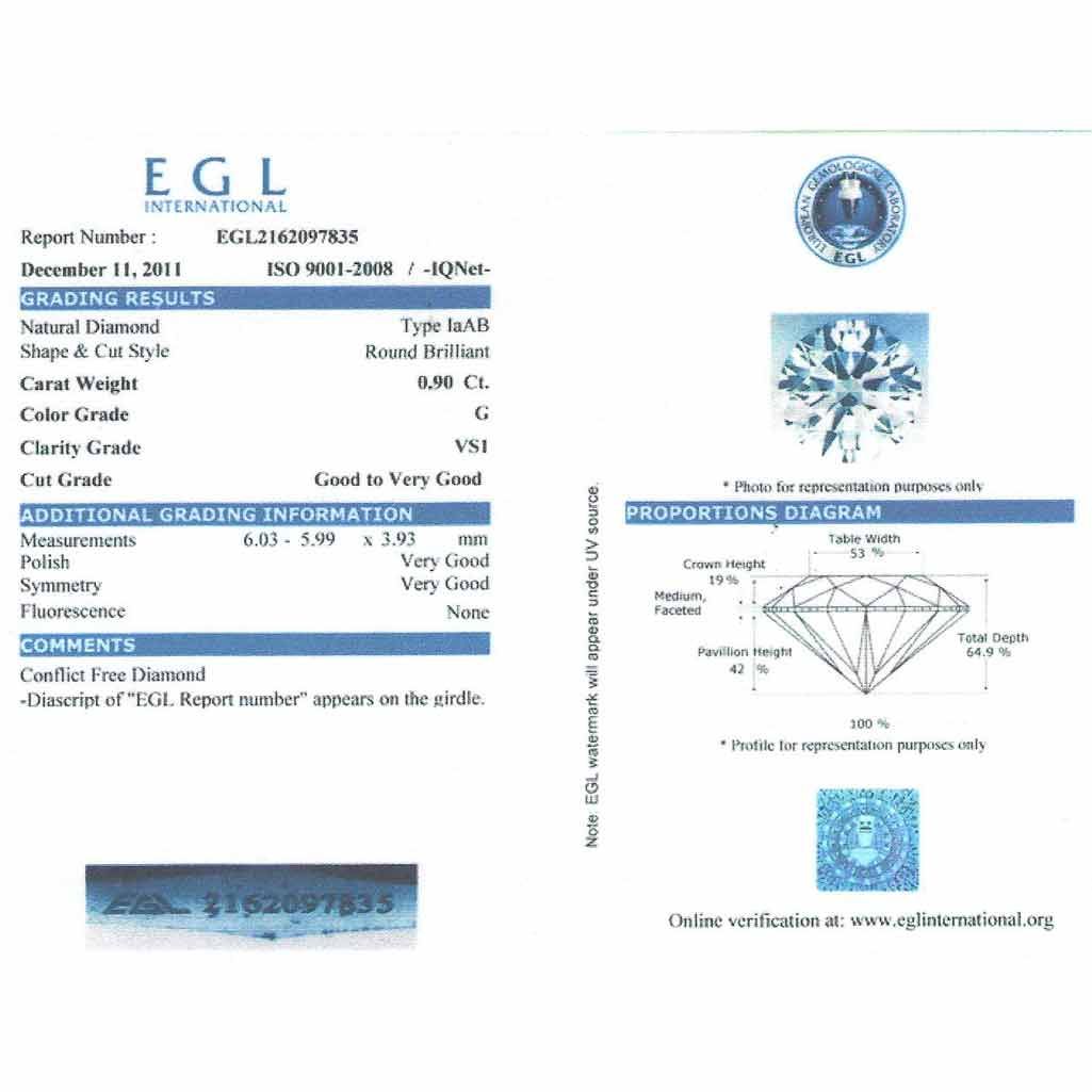 Diamond EGL Certfied Round 0.90 ctw G, VS1 **|**|** 6.03x5.99x3.93mm;Cut Very Good; Polish Very Good; Symmetry Very Good; Fluo None; Depth 64.9%; Table 53% ; MSRP: $9592