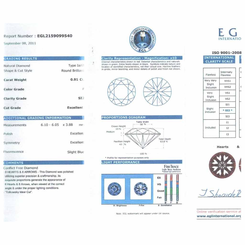 Diamond EGL Certfied Round 0.91 ctw F, SI2 **|**|** 6.10x6.05x3.88mm;Cut Excellent; Polish Excellent; Symmetry Excellent; Fluo Slight Blue; Depth 63.8%; table 58% ; MSRP: $7260