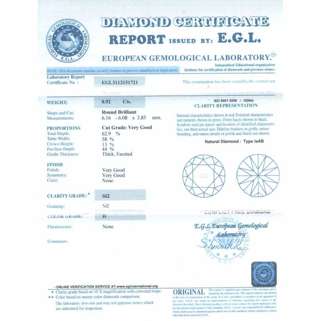 Diamond EGL Certfied Round 0.92 ctw D, SI2 **|**|** 6.16x6.08x3.85mm;Cut Very Good; Polish Very Good; Symmetry Very Good; Fluo None; Depth 62.9%; Table 58% ; MSRP: $8116