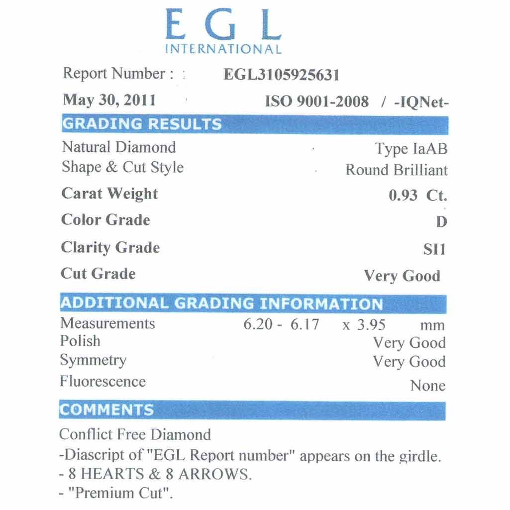 Diamond EGL Certfied Round 0.93 ctw D, SI1 **|**|** 6.20x6.17x3.95mm;Cut Very Good; Polish Very Good; Symmetry Very Good; Fluo None ; MSRP: $10024