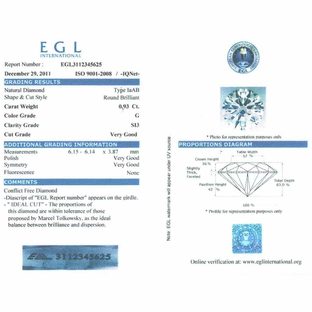 Diamond EGL Certfied Round 0.93 ctw G, SI3 **|**|** 6.15x6.14x3.87mm;Cut Very Good; Polish Very Good; Symmetry Very Good; Fluo None; Depth 63%; Table 57% ; MSRP: $5860