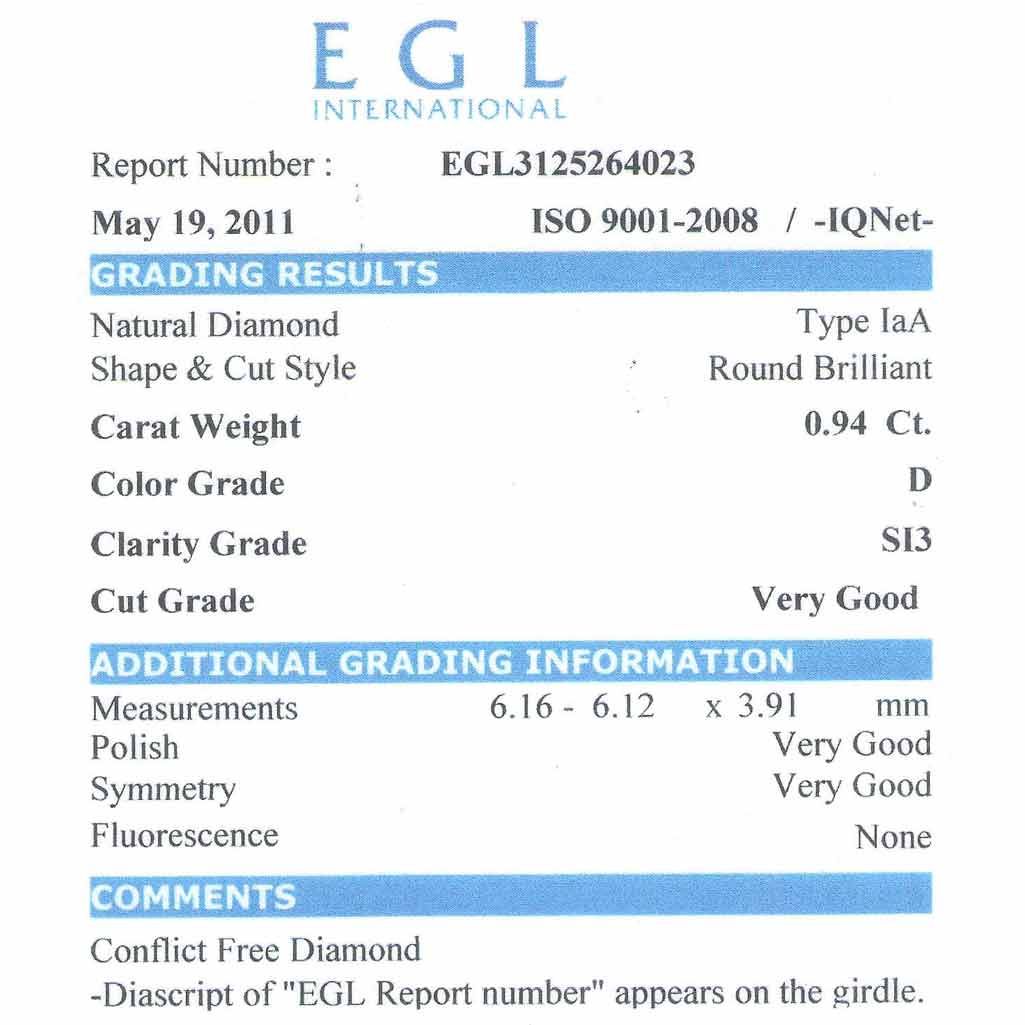 Diamond EGL Certfied Round 0.94 ctw D, SI3 **|**|** 6.16x6.12x3.91mm;Cut Very Good; Polish Very Good; Symmetry Very Good; Fluo None ; MSRP: $6712