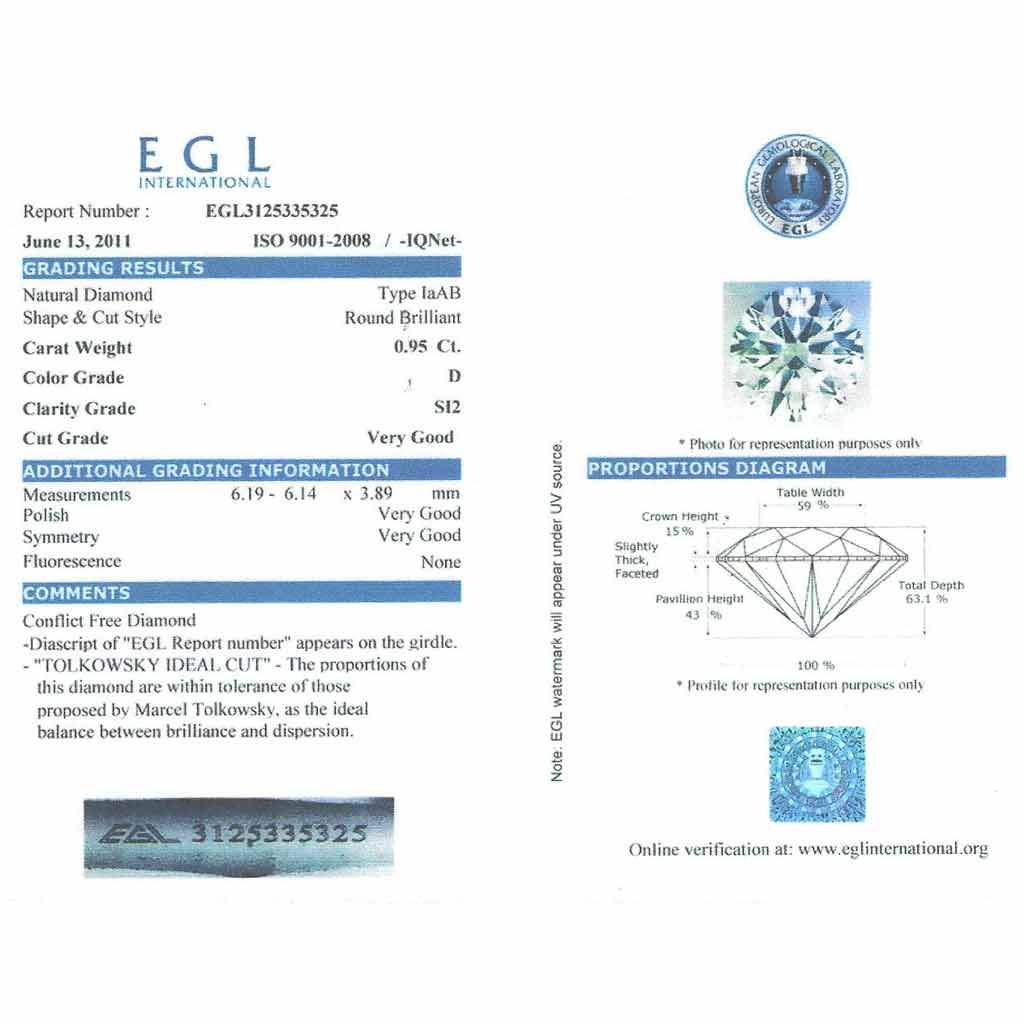 Diamond EGL Certfied Round 0.95 ctw D, SI2 **|**|** 6.19x6.14x3.89mm;Cut Very Good; Polish Very Good; Symmetry Very Good; Fluo None; Depth 63.1%; Table 59% ; MSRP: $9100