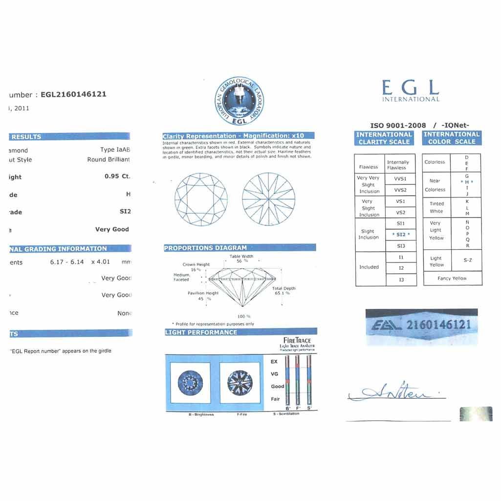 Diamond EGL Certfied Round 0.95 ctw H, SI2 **|**|** 6.17x6.14x4.01mm;Cut Very Good; Polish Very Good; Symmetry Very Good; Fluo None; Depth 65.1%; Table 56% ; MSRP: $7184