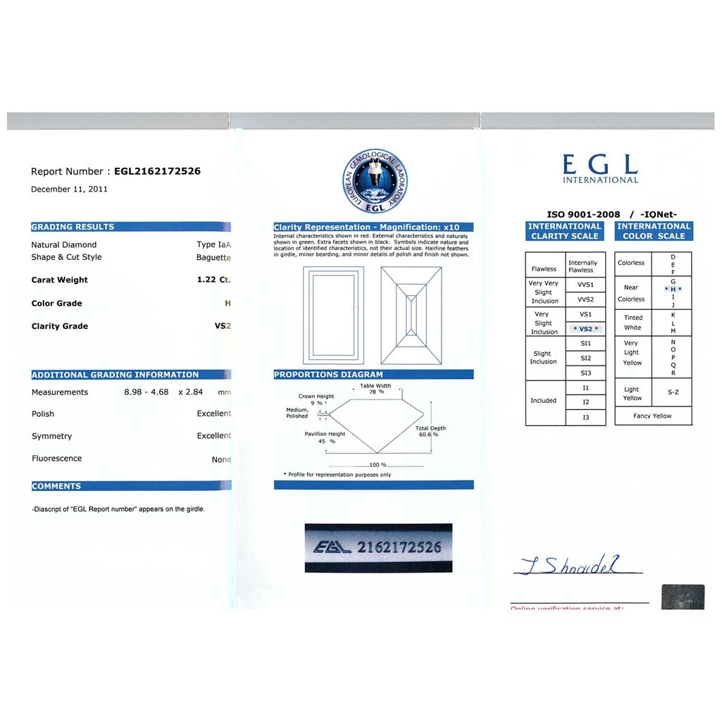 Diamond EGL Certified Baguette 1.22 ctw H, VS2 **|**|** 8.98x4.68x2.84mm;Cut Excellent; Polish Excellent; Symmetry Excellent; Fluo None; Depth 60.6%; table 78% ; MSRP: $11176