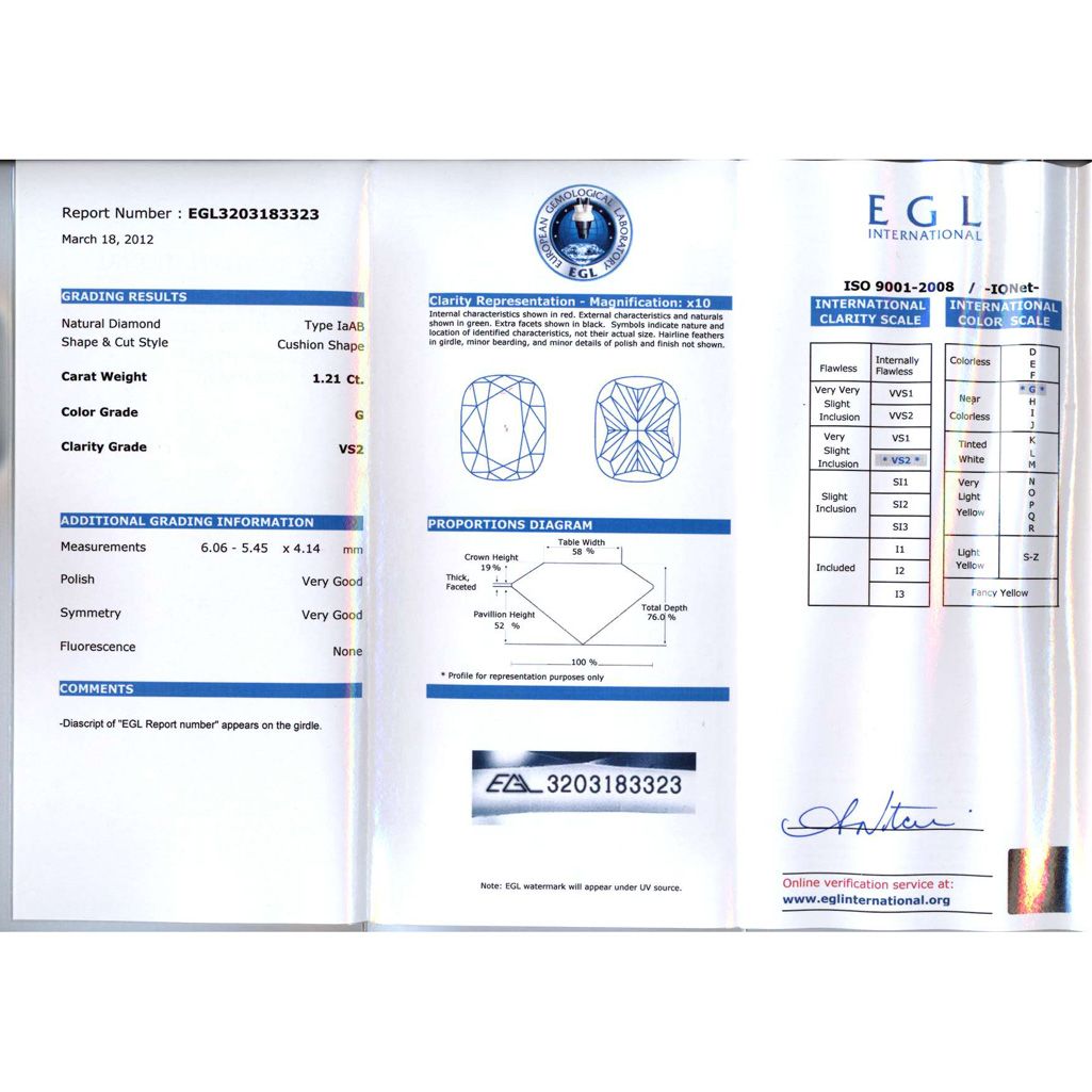 Diamond EGL Certified Cushion 1.21 ctw G, VS2 **|**|** 6.06x5.45x4.14mm;Cut Very Good; Polish Very Good; Symmetry Very Good; Fluo None; Depth 76%; Table 58% ; MSRP: $11344