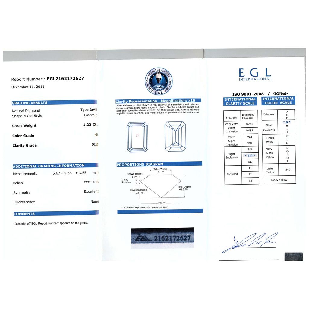 Diamond EGL Certified Emerald 1.22 ctw G, SI2 **|**|** 6.67x5.68x3.55mm;Cut Excellent; Polish Excellent; Symmetry Excellent; Fluo None; Depth 62.5%; table 67% ; MSRP: $10048