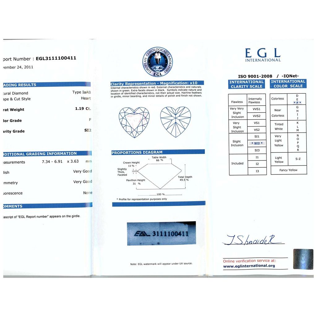 Diamond EGL Certified Heart 1.19 ctw F, SI2 **|**|** 7.34x6.91x3.63mm;Cut Very Good; Polish Very Good; Symmetry Very Good; Fluo NONE; Depth 49.5%; Table 66% ; MSRP: $8904