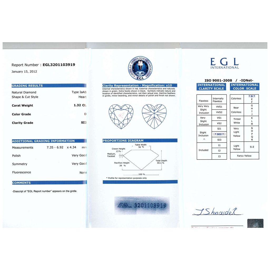 Diamond EGL Certified Heart 1.32 ctw D, SI2 **|**|** 7.35x6.92x4.34mm;Cut Very Good; Polish Very Good; Symmetry Very Good; Fluo None; Depth 59.1%; Table 56% ; MSRP: $11828