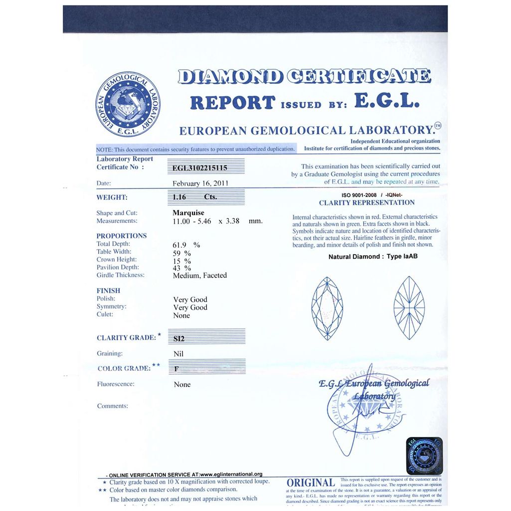 Diamond EGL Certified Marquise 1.16 ctw F, SI2 **|**|** 11.00x5.46x3.38mm;Cut Very Good; Polish Very Good; Symmetry Very Good; Fluo None; Depth 61.9%; Table 59% ; MSRP: $9772