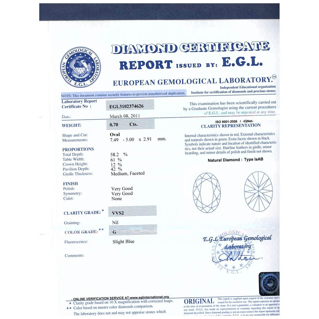 Diamond EGL Certified Oval 0.70 ctw G,VVS2 **|**|** 7.49x5.00x2.91mm;Cut Very Good; Polish Very Good; Symmetry Very Good; Fluo Slight Blue; Depth 58.2%; Table 61% ; MSRP: $5520