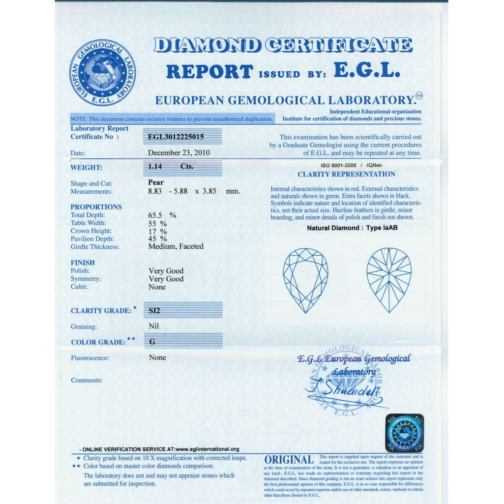 Diamond EGL Certified Pear 1.14 ctw G, SI2 **|**|** 8.83x5.88x3.85mm;Cut Very Good; Polish Very Good; Symmetry Very Good; Fluo NONE; Depth 65.5%; Table 55% ; MSRP: $8384
