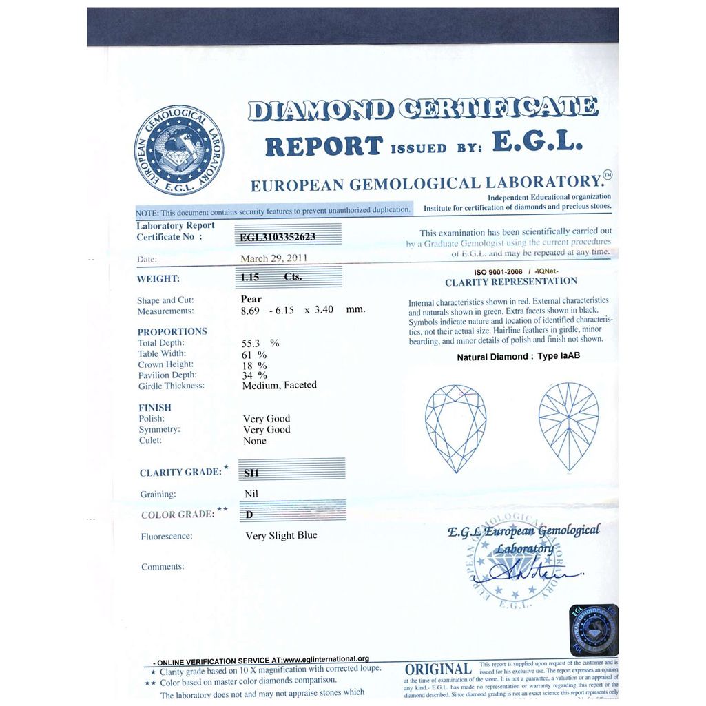 Diamond EGL Certified Pear 1.15 ctw D, SI1 **|**|** 8.69x6.15x3.40mm;Cut Very Good; Polish Very Good; Symmetry Very Good; Fluo Very Slight; Depth 55.3%; Table 61% ; MSRP: $11536