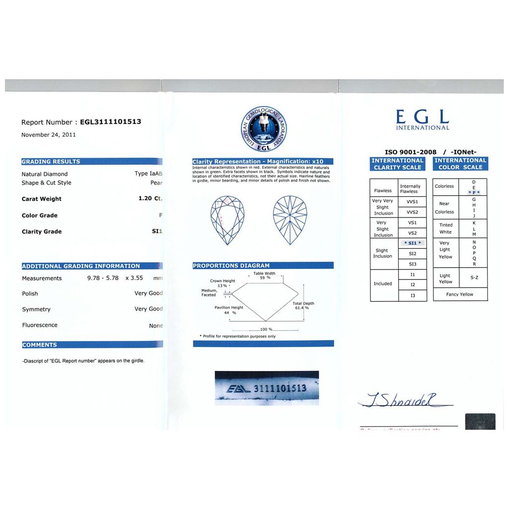 Diamond EGL Certified Pear 1.20 ctw F, SI1 **|**|** 9.78x5.78x3.55mm;Cut Very Good; Polish Very Good; Symmetry Very Good; Fluo None; Depth 61.4%; Table 59% ; MSRP: $11300