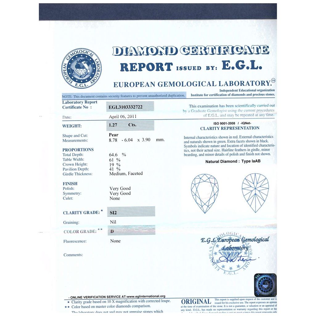 Diamond EGL Certified Pear 1.27 ctw D, SI2 **|**|** 8.78x6.04x3.90mm;Cut Very Good; Polish Very Good; Symmetry Very Good; Fluo NONE; Depth 64.6%; Table 61% ; MSRP: $10108