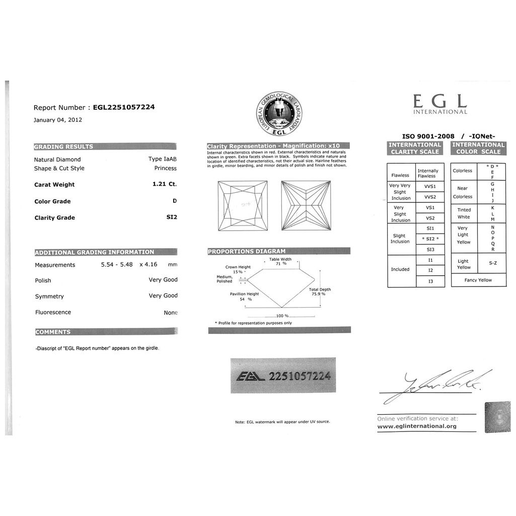 Diamond EGL Certified Princess 1.21 ctw D, SI2 **|**|** 5.54x5.48x4.16mm;Cut Very Good; Polish Very Good; Symmetry Very Good; Fluo None; Depth 75.9%; Table 71% ; MSRP: $11324